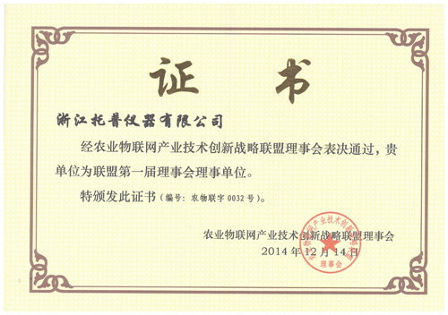 2014年6月7日,北京智慧農業物聯網產業技術創新戰略聯盟籌備成立大會暨第一次會員代表大會在北京召開。會議宣讀了決定準予《北京智慧農業物聯網產業技術創新戰略聯盟》籌備的行政批復,并經首屆理事會表決,選舉產生了第一屆聯盟組織機構,其中包括首屆聯盟主席單位,五家聯盟副主席單位,“浙江托普儀器有限公司”等八家單位當選為聯盟第一屆理事會理事單位。