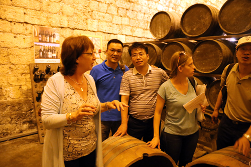 圖為:托普儀器陳渝陽總經理(左二)隨考察團參觀葡萄酒廠