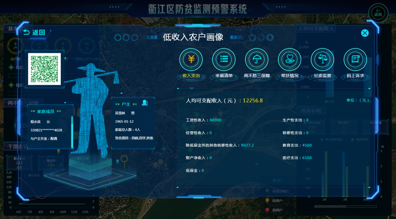 防貧監測預警系統的主要功能是返貧監測和預警處置,為農戶賦“幸福碼”,通過大數據實行“碼上監測”,干部端和農戶端皆可掃碼展現低收入農戶的微觀畫像和政府補貼收入清單等相關內容,實現“碼”上提訴求、“碼”上看成效,同時還有扶貧成效展示、結對干部走訪應用等功能。利用大數據技術實現返貧監測預警,整合社會資源,探索出了一條從“輸血”到“造血”轉變的路徑。