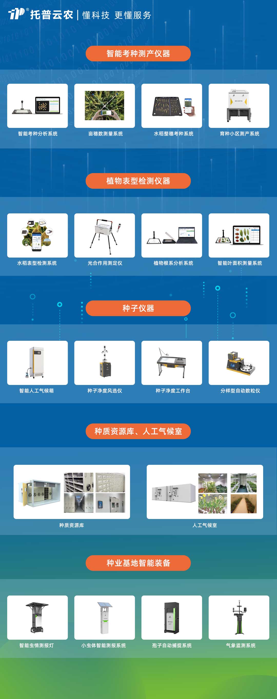 在數字育種方面,為提高現代育種效率,托普云農自主研發了系列智能裝備,涵蓋種子的根-莖-葉-花-果實全生育期,從選擇育種、種子前處理到育苗、表型及環境數據采集、田間試驗測試、制種生產等全過程智能化,充分解放人力。