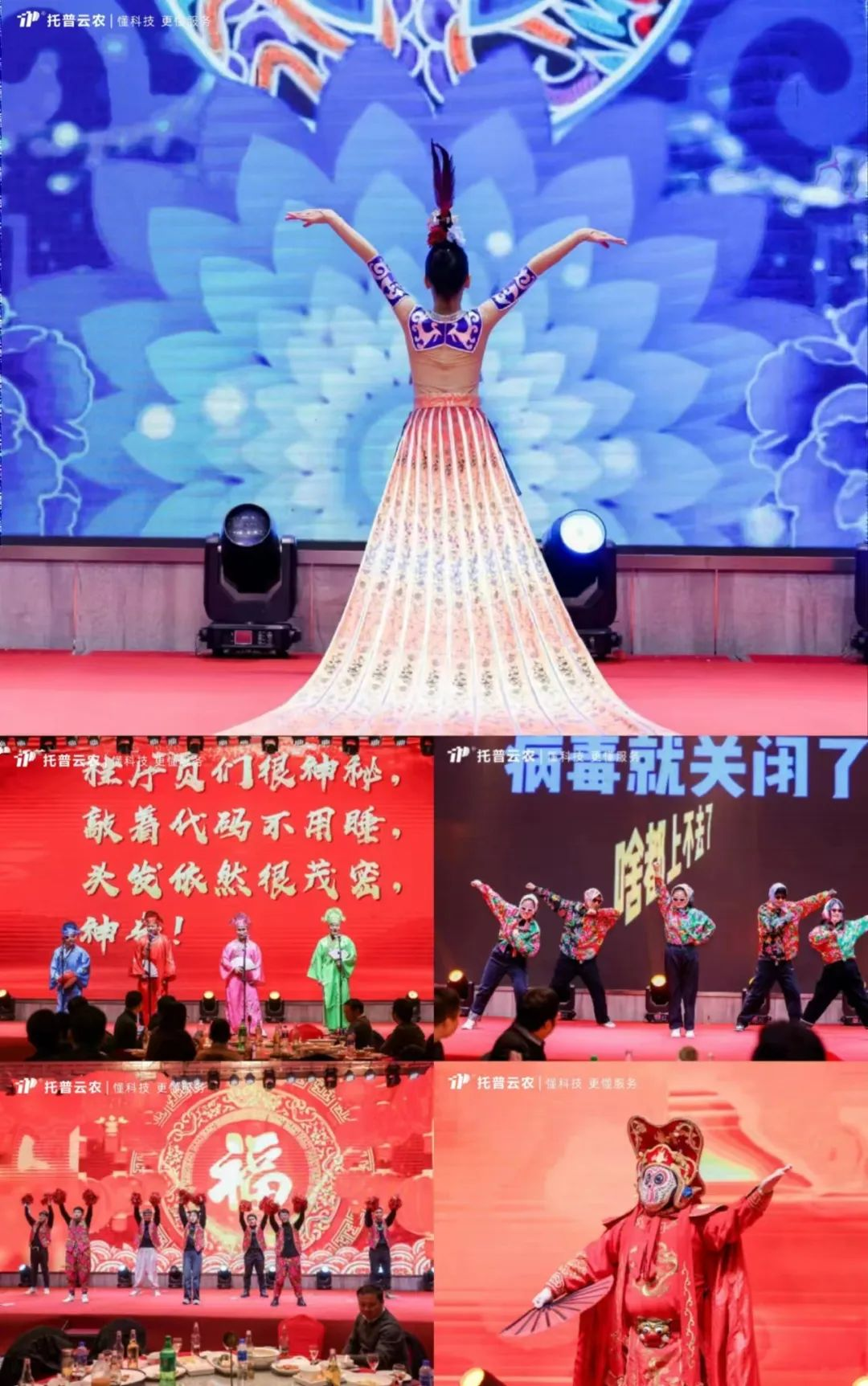 龍躍新篇,盛啟輝煌。在璀璨奪目的燈光下,一場盛大的年會在熱烈的氛圍中拉開帷幕。創(chuàng)意多才的托普人為晚會呈現(xiàn)了一場包含舞蹈、演唱、小品及曲藝的視聽盛宴。神秘的抽獎環(huán)節(jié)和游戲互動環(huán)節(jié)更是將年會氣氛推向高潮,尖叫和歡呼聲貫穿全場。歡欣鼓舞的歌曲里,彌漫著對未來的憧憬與激情,觥籌交錯之間,洋溢著豐收的暢快。這是托普云農大家庭在2023這個里程碑式的一年中,歡聚一堂、共享喜悅的重要時刻……