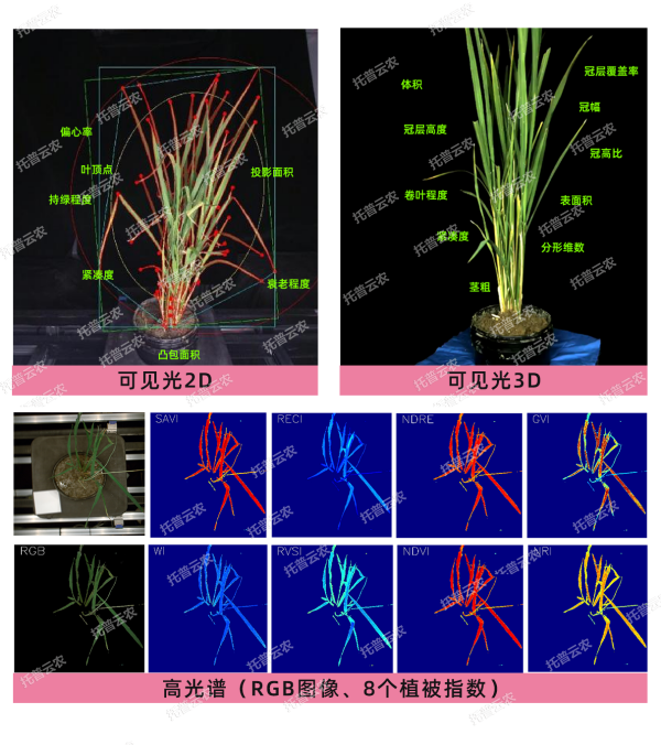 高通量植物表型采集分析平臺集成了可見光二維、可見光三維、高光譜等成像模塊,整合多種傳感器,能夠獲取植物全生育期高通量表型信息,覆蓋不同生境下植物器官、單株、群體的形態、生理等120多種表型指標,超越國外主流同類型裝備。