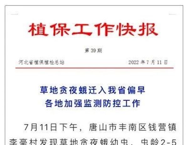 2022年7月,依托布設(shè)于河北省內(nèi)的智能蟲情測報燈,監(jiān)測到省內(nèi)有草地貪夜蛾出現(xiàn)。經(jīng)過及時與當(dāng)?shù)夭块T匯報確認(rèn),河北省植保植檢總站迅速作出部署,發(fā)布一系列防范措施,要求各地加強監(jiān)測防控工作。