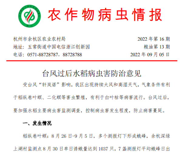 余杭區(qū)農(nóng)業(yè)農(nóng)村局發(fā)布防治意見