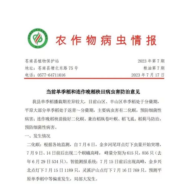 在浙江溫州,2023年7月,托普云農(nóng)智能蟲情測報燈監(jiān)測到二化螟高峰,蒼南縣植物保護(hù)站隨即發(fā)布農(nóng)作物病蟲情報,預(yù)測平原單季稻中等偏重發(fā)生,局部大發(fā)生,加強防范。