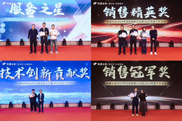 過去的2024年,托普云農人才輩出,各領域先進典型不斷涌現。本次年會,公司為2024年度在各個崗位上表現卓越的個人和團隊,頒發了包括最佳新人、優秀員工、服務之星、技術創新、銷售精英、最佳團隊、總經理特別獎、托普特別貢獻人物等在內的十余個獎項。他們以卓越的表現詮釋了何為托普精神,用堅持照亮了全體員工的奮進方向。表彰儀式氣氛熱烈,公司對這些優秀員工及團隊的高度認可,贏得了現場陣陣掌聲。