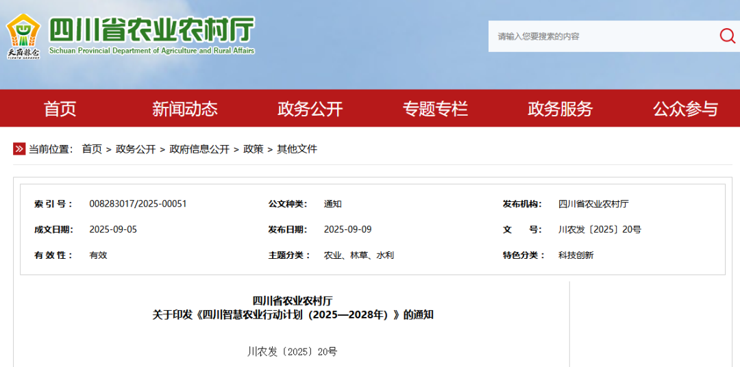 近年來,四川省錨定 “打造新時代更高水平‘天府糧倉’” 目標,持續(xù)推進糧食穩(wěn)面增產(chǎn),深化 “天府糧倉?百縣千片” 建設(shè)。為進一步為“天府糧倉”注入數(shù)智動能,四川省農(nóng)業(yè)農(nóng)村廳近日印發(fā)《四川智慧農(nóng)業(yè)行動計劃(2025—2028 年)》(以下簡稱《計劃》),提出到“瞄準打造新時代更高水平“天府糧倉”,以推進物聯(lián)網(wǎng)、衛(wèi)星遙感、人工智能、大數(shù)據(jù)等現(xiàn)代信息技術(shù)在農(nóng)業(yè)農(nóng)村領(lǐng)域全方位全鏈條普及應(yīng)用為主線,加快推進四川農(nóng)業(yè)農(nóng)村現(xiàn)代化”,為四川智慧農(nóng)業(yè)發(fā)展畫出清晰 “路線圖”。