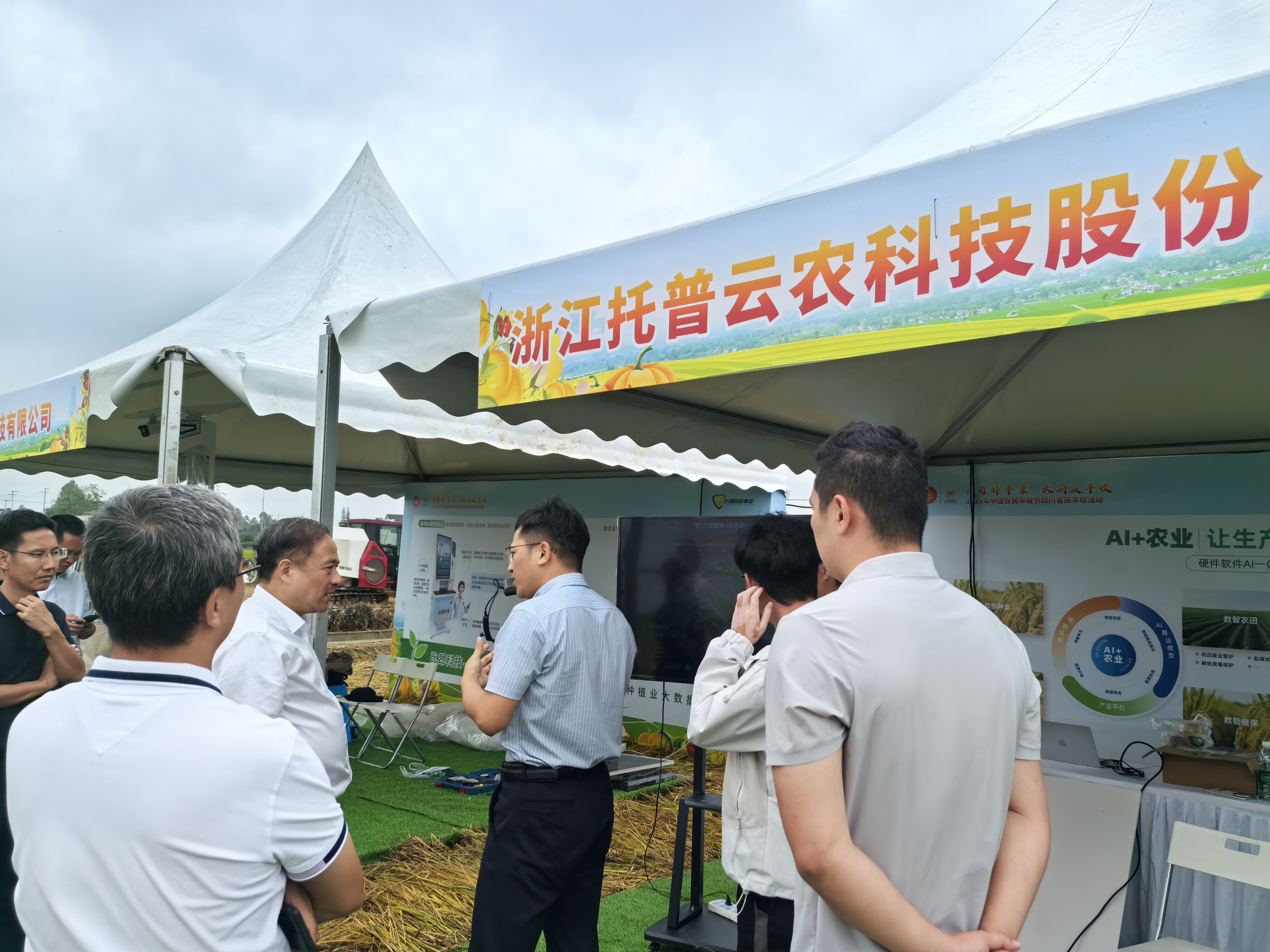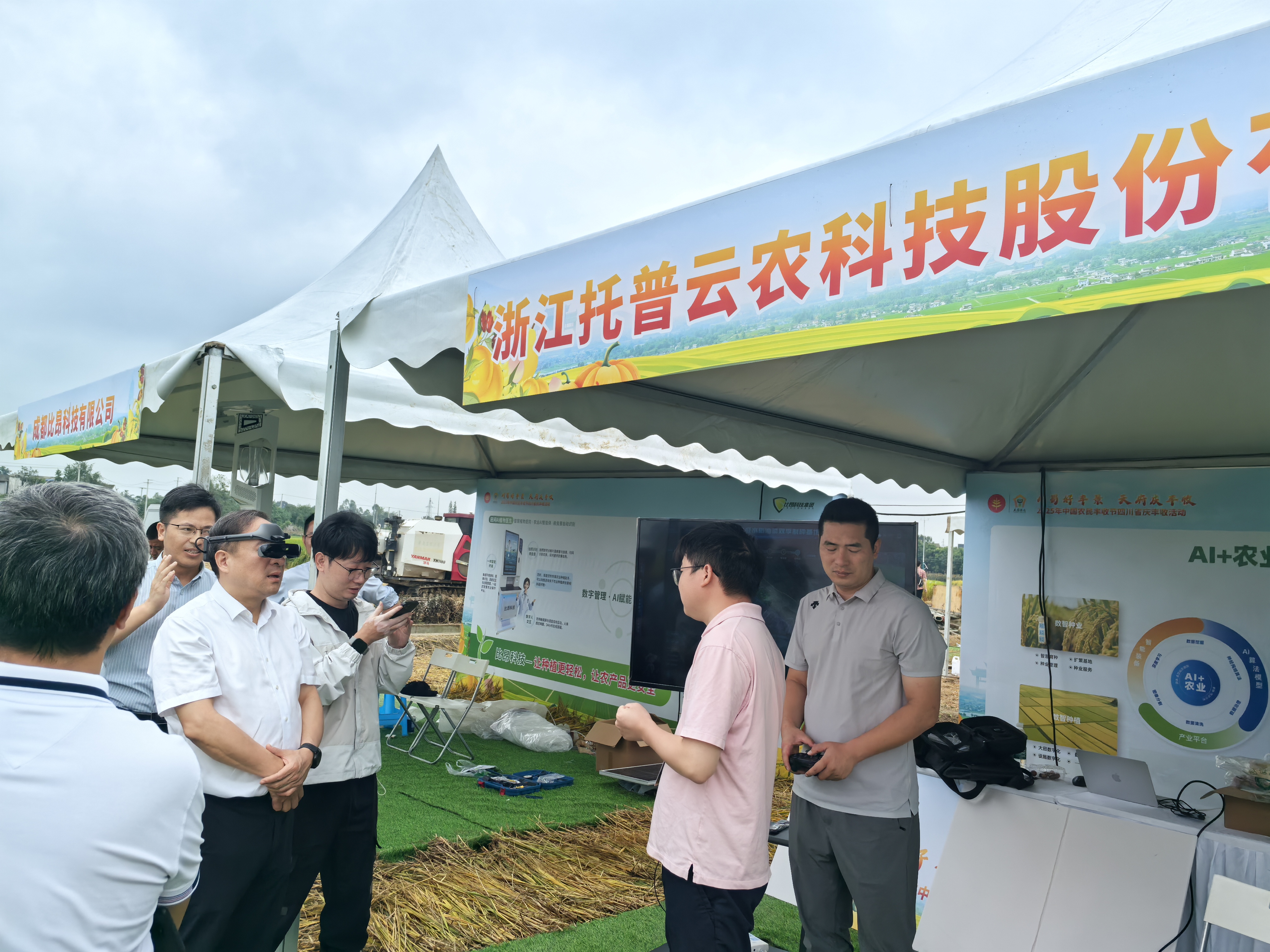在智慧農(nóng)業(yè)示范體驗區(qū),托普云農(nóng)自主研發(fā)打造的AI智能體「問稷」,以及AI+無人機、AR智能眼鏡、田間機器人(狗)等一系列數(shù)智化“新農(nóng)具”整齊陳列,工作人員正現(xiàn)場演示設(shè)備操作流程,吸引了眾多嘉賓駐足觀看。其中,幾位前來考察的領(lǐng)導(dǎo)對造型輕便的 AR 眼鏡格外感興趣,主動詢問功能并試戴體驗。據(jù)介紹,AR 眼鏡能讓農(nóng)技人員實時獲取作物生長狀態(tài)、病蟲害情況;田間機器人(狗)可快速采集傳輸?shù)孛姝h(huán)境數(shù)據(jù);結(jié)合「問稷」AI 智能體,能為田間生產(chǎn)管理提供精準農(nóng)事操作建議。