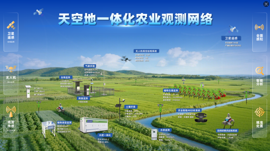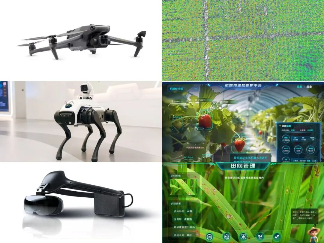 通過融合衛(wèi)星遙感、無人機低空遙感、智能機器人(狗)、農(nóng)情監(jiān)測站、高精度農(nóng)業(yè)傳感器等智能裝備,構(gòu)建“空天地”全方位監(jiān)測體系,全面實時高效采集農(nóng)田環(huán)境、水分、肥力、病蟲害、作物生長等信息。