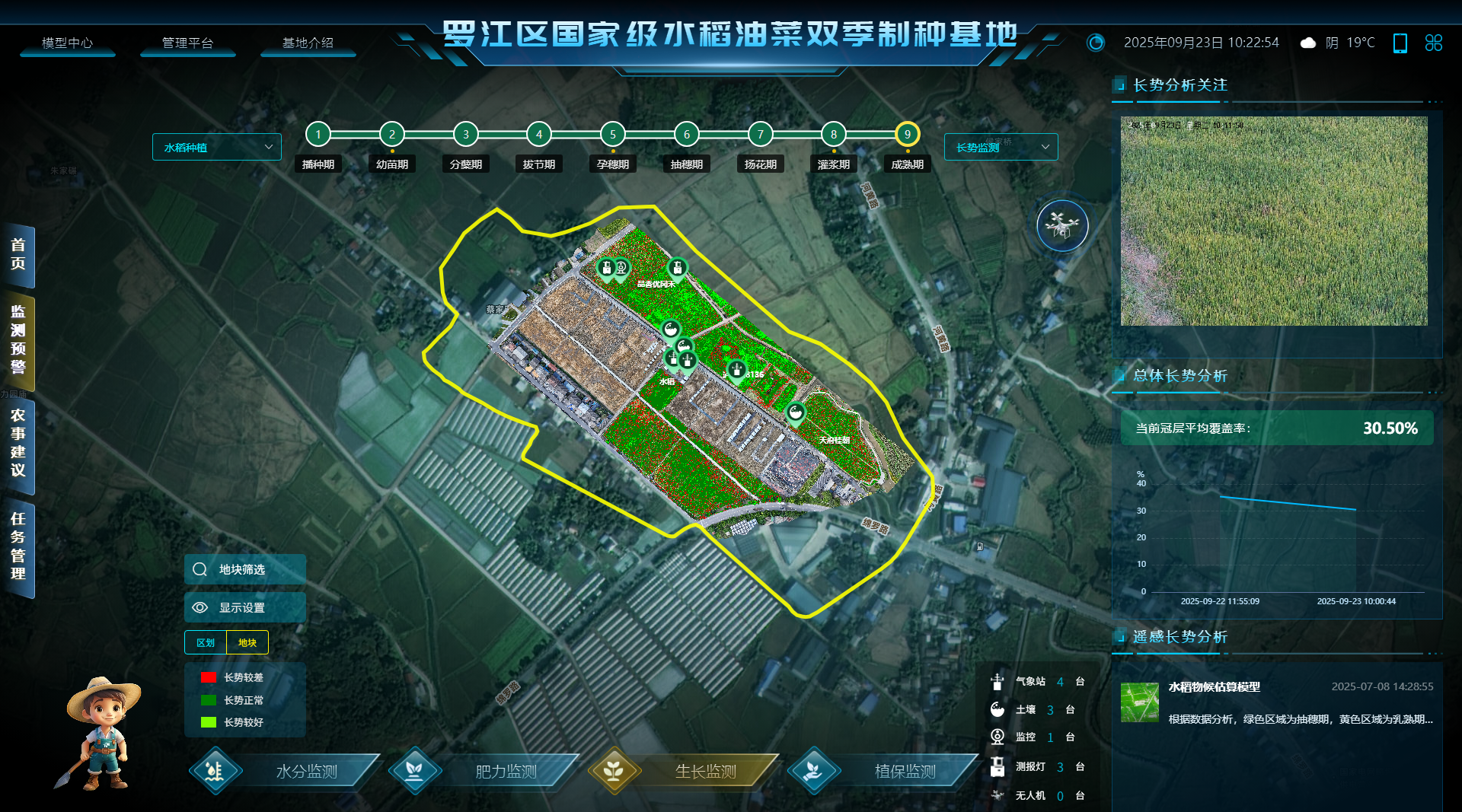 以水稻生長周期為主線,結(jié)合托普自主研發(fā)的水稻生育期預(yù)測、變量灌排、變量施肥、變量施藥等模型算法,摸清作物的生長規(guī)律,為大田精細化管理提供決策支撐。